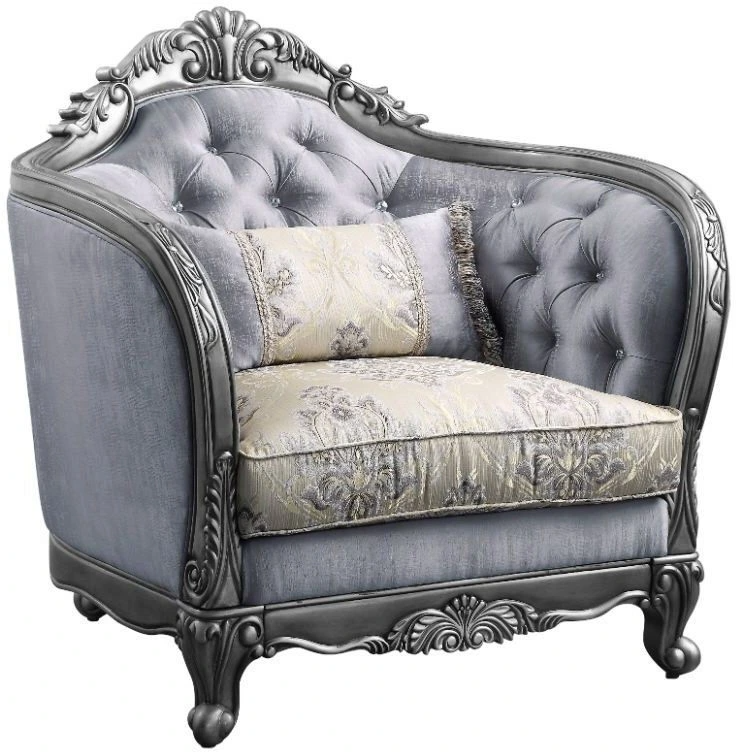 The Ariadne chair is fit for royalty! The platinum finish of the wooden frame complements the lustrous upholstery over button-tufted seatback and armrests. Carved flourishes crown the arched seatbacks and extend down the molding around the high shelter armrestsRead More