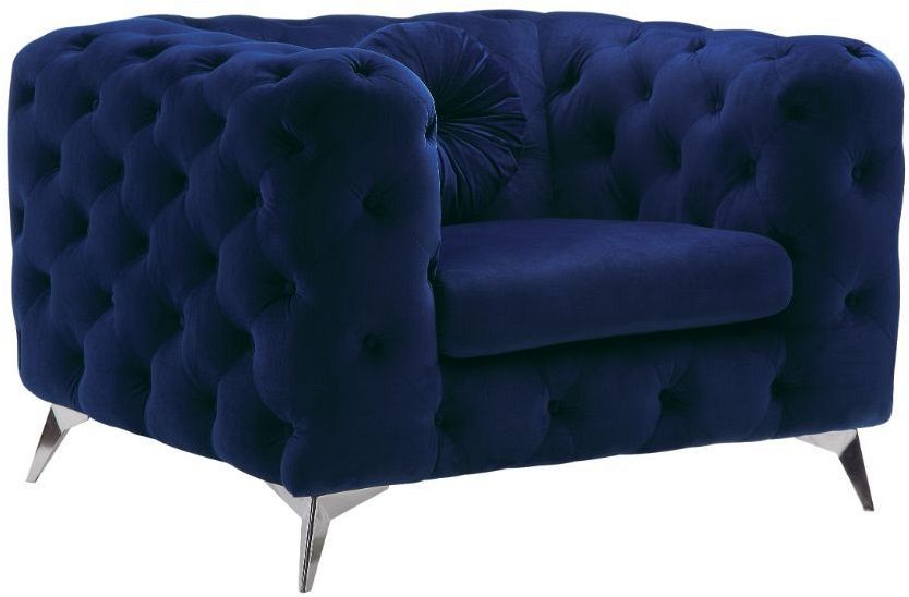Elegant and eye-catching, the beautiful Atronia chair is the perfect addition to any space. Chic button tuft design with bright blue cover, strength, and beauty guaranteed with sturdy wood frame and chrome legs. This chair is bound to be the conversation piece.Read More