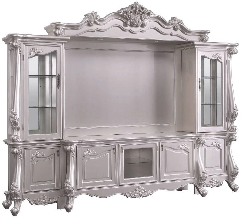 The Bently entertainment center is the perfect centerpiece for your media room. Gorgeous carved floral motifs and over-sized Queen Anne legs grace each part of this set. The TV stand easily accommodates a 70-inch panel TV. Coupled with the side piers, you'll have provide plenty of storage space for organization or display.Read More