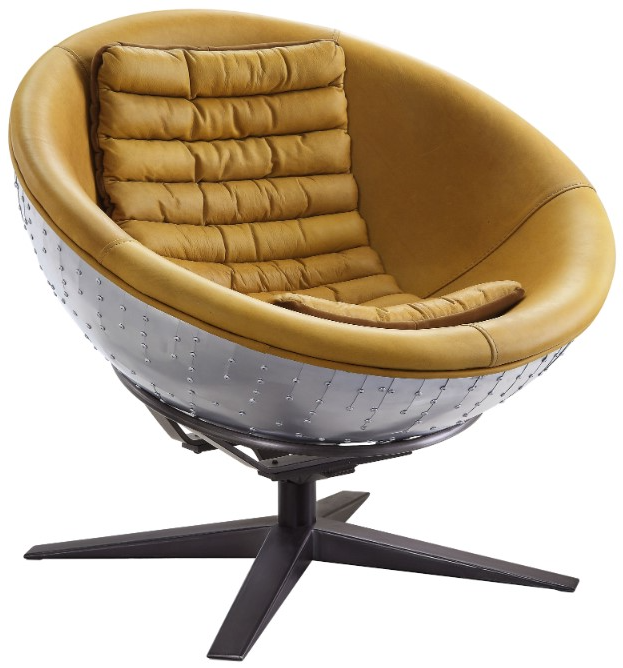 The Brancaster accent chair has a cool retro-futurist design that you won't find anywhere else. The warm hues of its turmeric top grain leather upholstery coats the round, dish-shaped interior, contrasting with the riveted aluminum exterior of the chair back like a space capsule.Read More