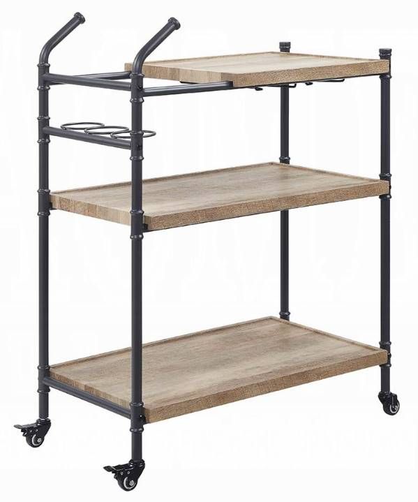 The Brantley Oak/Sandy Black Serving Cart is a stylish and functional addition to any home. It features three oak wood grain finish shelves and a sturdy metal frame with a unique water pipe design in a sandy black finish.Read More