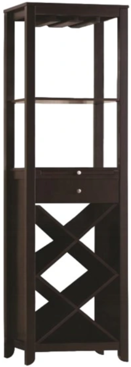 Storage: 2 open compartments, 1 drawer, 1 tray, wine bottle rack (9 compartments: "x" shape shelves)