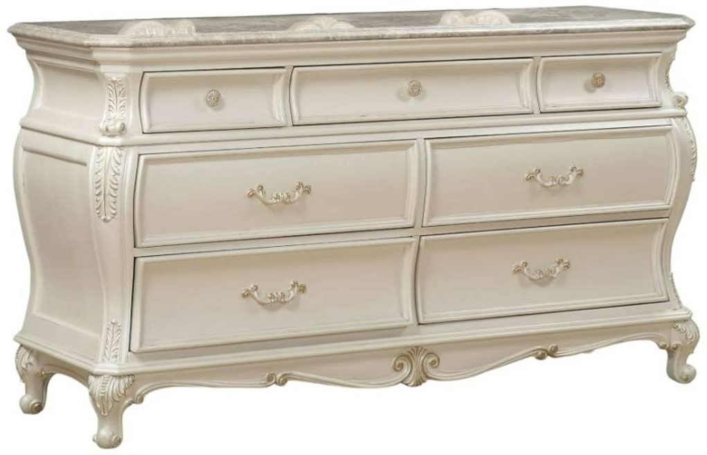 The Chantelle Dresser with Granite Top features seven felt-lined pull-out drawers with delicate drop handles and an antique platinum finish. The 1st Avenue collection strives to create a warm and comfortable environment in every home without sacrificing style and sophistication.Read More