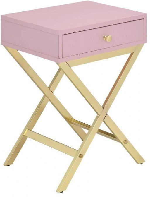 The ACME Furniture Coleen Pink Side Table with Gold Base is a chic and functional accent piece, combining contemporary design with practical storage. It features a pink veneer top and a gold metal "X" trestle base, adding elegance to any room.Read More