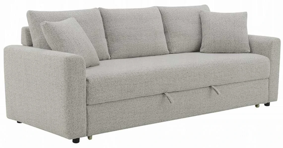 The Haran collection sofa in beige boucle fabric is a blend of elegance and functionality. Featuring a wooden inner frame, it effortlessly transforms into a full-size pull-out sleeper.The removable cushion and back cover, along with included accent pillows, add to its comfort and style, making it a perfect addition to any living space.