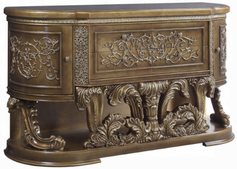 The grand Baroque style of the Constantine collection is sure to impress. With a beautiful bronze finish to emphasize the scrollwork and regal aspects of the collection. The bed features intricately carved embellishments and an oversized PU padded headboard, it is sure to be the focal point of your bedroom. The matching case goods provide style and plenty of storage with their ample drawers. Transform your bedroom into a glamorous boudoir with the Constantine collection.