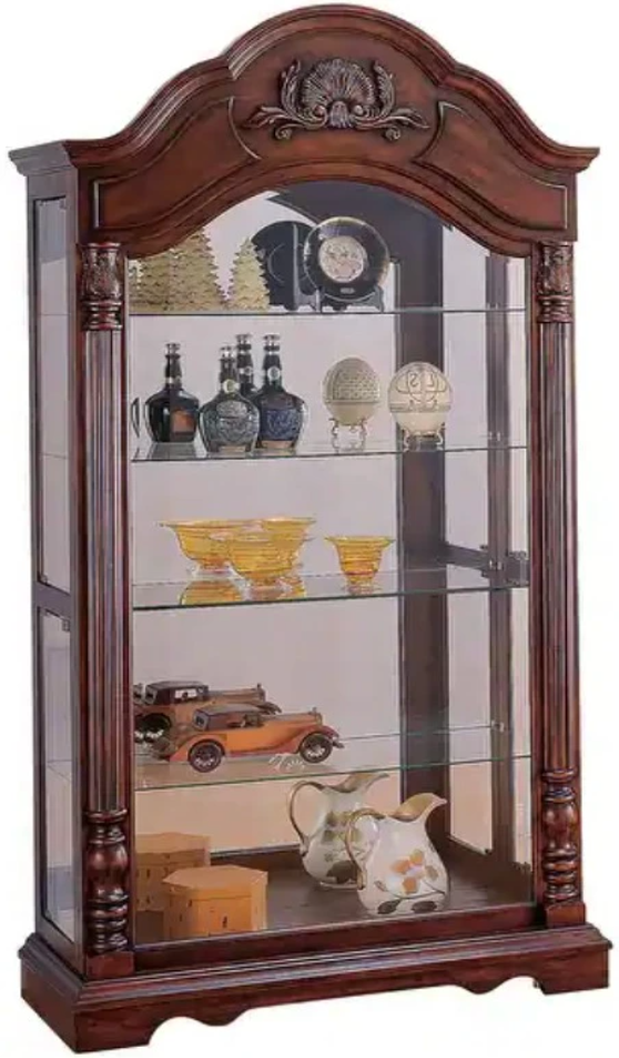 This sophisticated cabinet in a warm cherry finish features a detailed bonnet top and palmetto carved accents adding a formal, traditional feeling to the cabinet.'The open glass shelves are the perfect place to display glassware or other collectables in a fashionable way. This curio cabinet is a compliment to any home.
