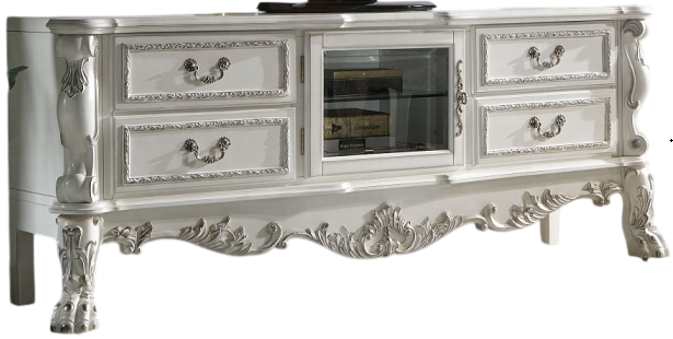 Grandly display your TV, with the grand and elegant Dresden TV stand. The gorgeous bone white finish is highlighted with hand-brushed silver accents to help enhance the beautiful trim details. This TV stand features a scalloped edge and four side drawers that offer plenty of space for remotes and manuals.Read More