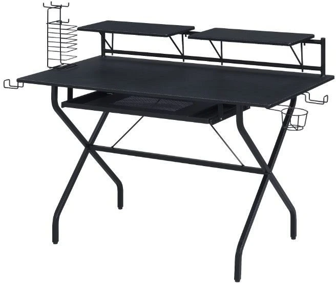 Bring a compelling and cohesive aesthetic in your arrangement with this Hartman computer desk. Offers sufficient room for 2 monitors and keyboard tray, this piece is your perfect choice whether for working tax bills or playing online games. Featuring rich black finish, it will blend in any room decor flawlessly.Read More
