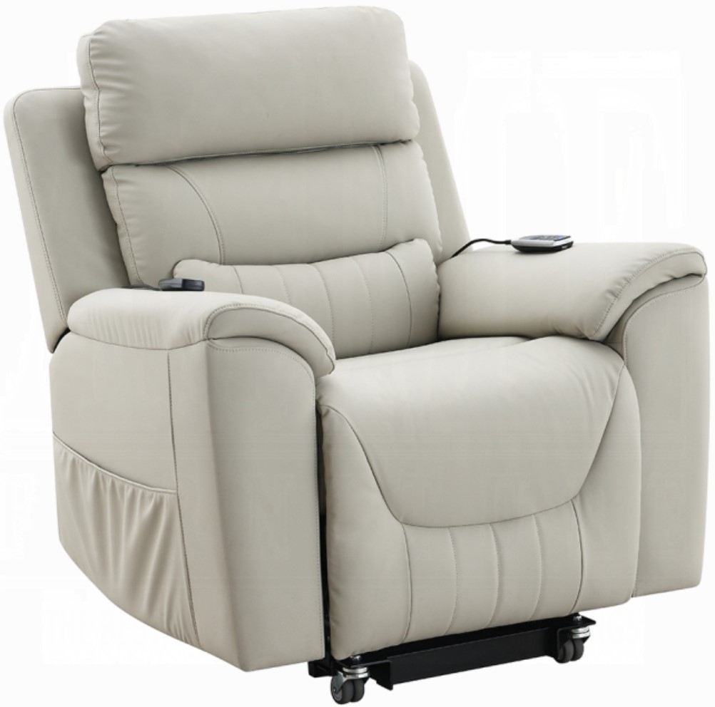 Indulge in luxury with this Marsha collection power recliner includes heating and massage functions and wrapped in light gray silicone synthetic leather. This recliner offers superior comfort with its ergonomic design, pocket coil seat construction, and tight seat and back cushions.Read More