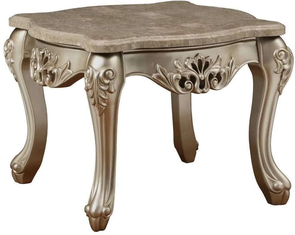 The Ranita Marble Top End Table combines elegance and traditional design, featuring a luxurious scalloped marble top imported from Spain. Its base is finished in a stunning champagne tone with intricate carved floral motifs and classic Queen Anne-style legs, made from poplar wood.Read More
