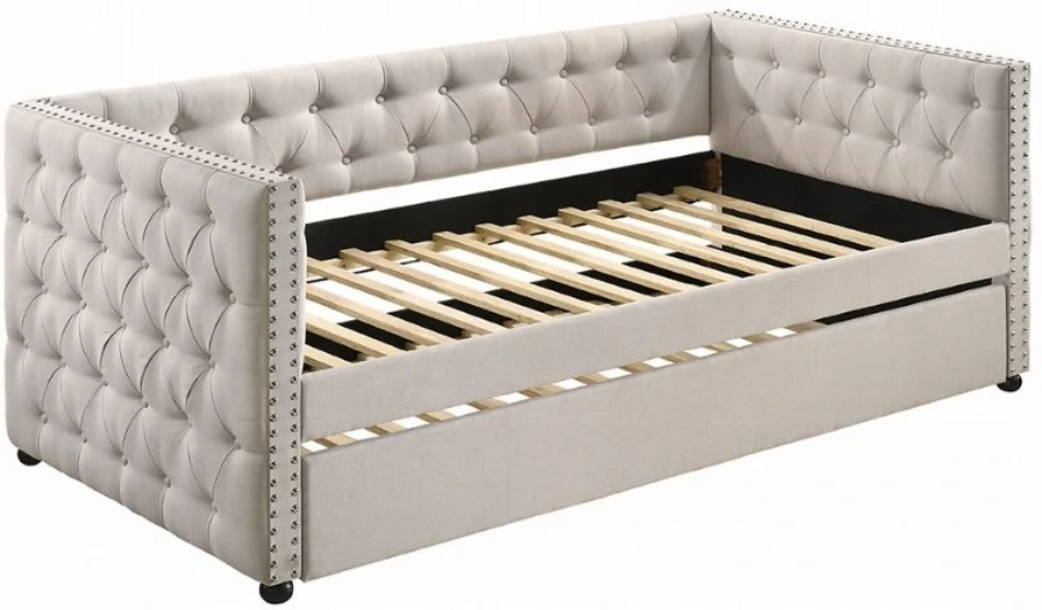 Maximize the space in your guest room with this Romona daybed & trundle. An excellent choice for any guest room that doubles as a study, or as extra sleeping space in a bedroom. Beautiful, timeless details such as button tufting and nail-head trim accents give off the right amount of luxury and sophistication.Read More