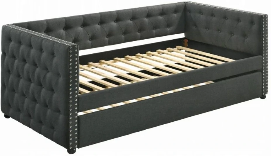 Maximize the space in your guest room with this Romona daybed and trundle. An excellent choice for any guest room that doubles as a study, or as extra sleeping space in a bedroom. Beautiful, timeless details such as button tufting and nail-head trim accents.Read More