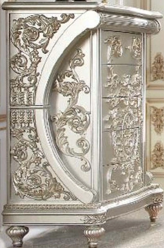 A luxurious antique silver finish with hand-brushed gold accents makes up the Sandoval chest. Surrounded by fine Rococo scrolls and floral ornament crowns with beautiful, stylized ribbons. Featuring five ample storage drawers that will keep clutter at bay. Decorate the tabletop with your favorite family heirlooms for a personalized touch.Read More