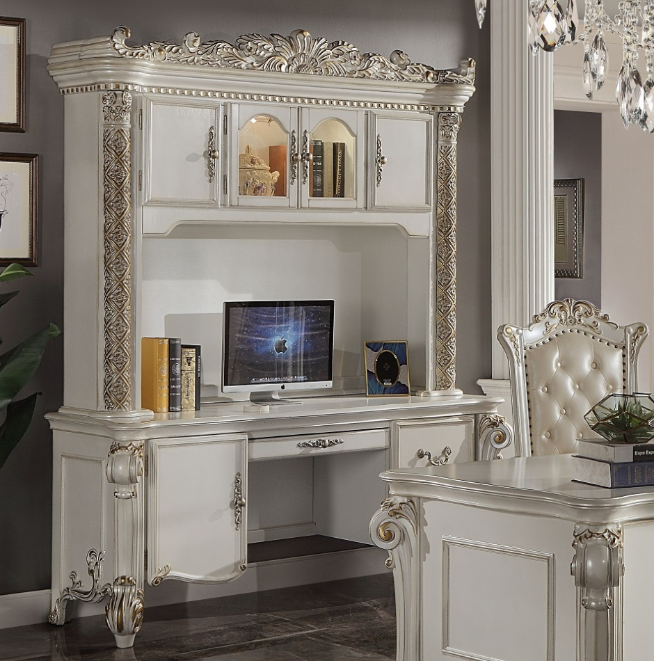The Vendome computer desk and hutch were inspired by old European design. This desk features highly decorative scrollwork with an antique gold hand-brushed finish. These pieces are crafted of specialty-selected woods with a pearl white finish and include ample storage for all office supplies and paperwork.Read More
