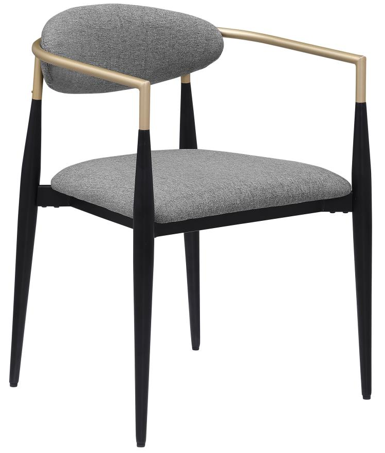 A gray dining armchair featuring soft, upholstered fabric and cushioned seating for comfort. It has sleek, slightly curved arms and sturdy legs with a modern design, making it a stylish and comfortable addition to any dining space.Read More