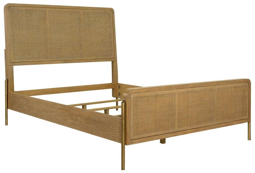 Elevate your retro-inspired bedroom with this mid-century modern style bed, designed with a charming wire-brushed, sand wash finish across its elegant woven cane panel wood headboard and footboard. Adding a modern glam touch are slender metal tube legs in a warm, metallic finish that offer a striking accent.Read More