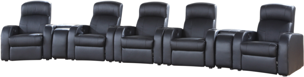 Home theater collection upholstered in black top grain leather everywhere the body touches