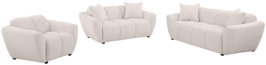 Plush, sculptural, and undeniably bold, this modern sofa set showcases chunky silhouettes wrapped in soft greige chenille. Wide splayed arms frame deep, channel-tufted contours, while attached waterfall seats are built with pocket coil construction for long-lasting support. Textured upholstery adds dimension to the grid-like shaping, offering a refined yet cozy aesthetic.Read More