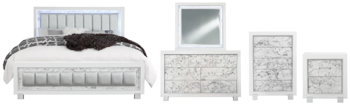 Set includes a King bed, chest, dresser, mirror and nightstand