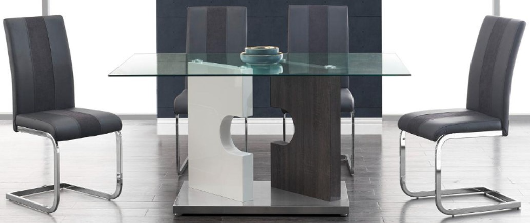Host in style with this elegant, spacious contemporary dining table. Featuring a striking double pedestal base in gray wash and white, a glass top, and sleek metal supports, it delivers modern appeal. Quality craftsmanship throughout makes it a standout centerpiece and a must-have addition to your dining space.Read More