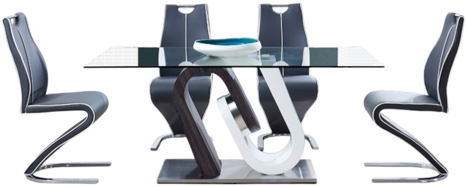 Looking to make an instant style statement then this clear glass top dining table is for you. Design elements include a two-toned geometrically designed base fused with a polished chrome accent and a glass top providing enough space for all your entertaining needs.Read More