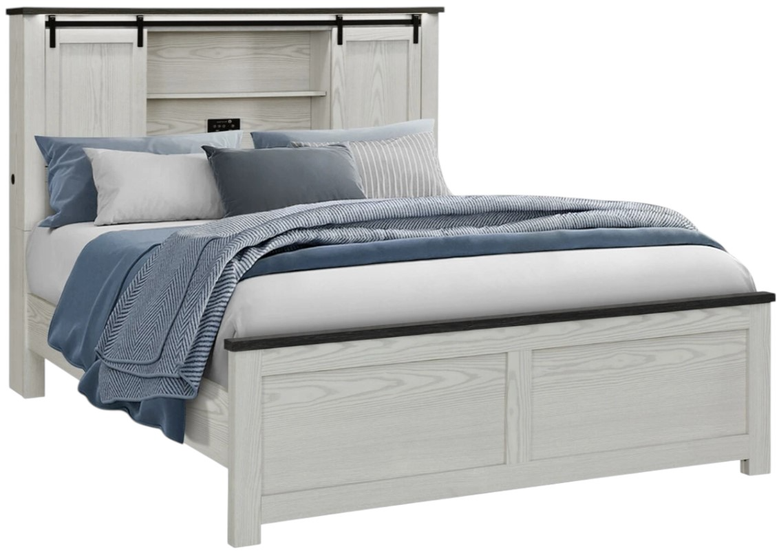 The headboard is the standout feature, featuring a sliding barn door with hidden storage, integrated LED lights, and built-in USB ports and Bluetooth speakers for added convenience and entertainment. Designed for comfort and style, this bed brings a touch of sophistication to any modern bedroom.