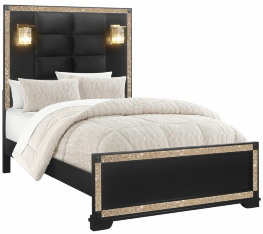 The Blake bedroom combines style and elegance with many beautiful features. The collection is outlined with gold-colored crushed crystal to highlight its unique design. The Bed has a tall headboard and two lights along with quilted padding. The lights add style, design and function which can be used as reading lights.Read More