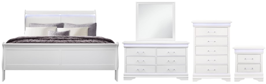 Set includes a queen bed, dresser, mirror, chest and nightstand