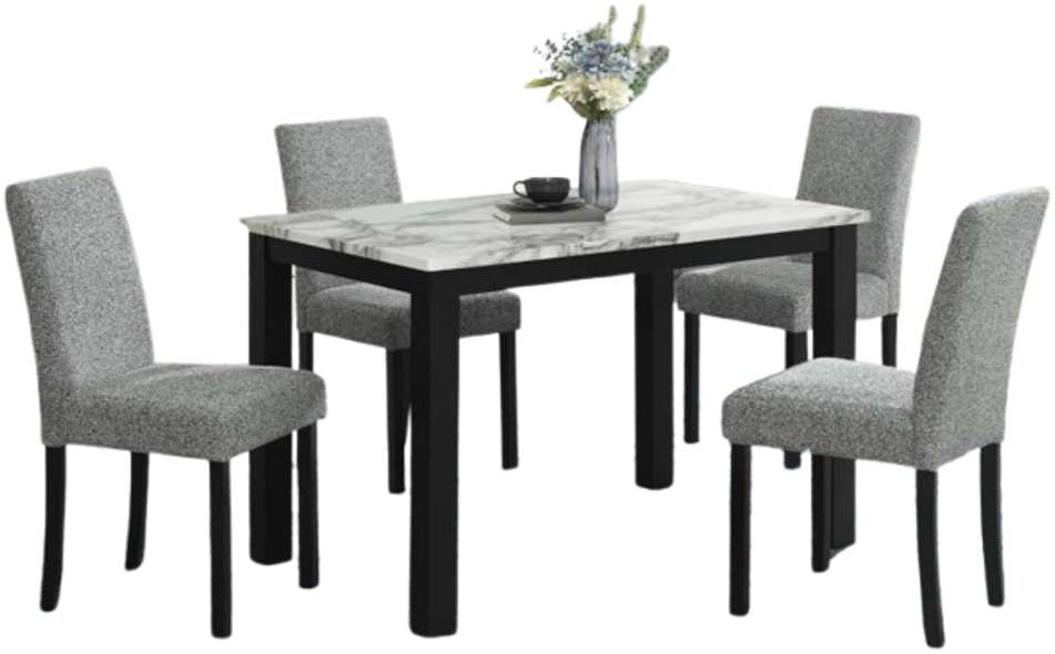 It is complemented by the D9026 Grey Dining Chairs, which provide comfort and style with their soft light grey upholstery and streamlined design. This elegant 5-piece set includes one dining table and four chairs, all carefully packaged to ship in one convenient carton. Perfect for both everyday dining and special occasions, this dining set offers both beauty and practicality for your home.
