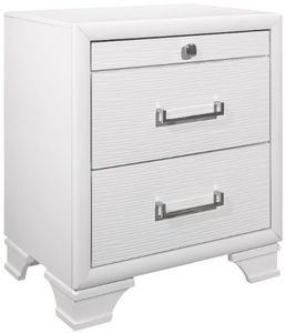 The headboard features built-in lighting and two storage drawers for convenience. All case pieces are lacquer finished and feature nickel hardware. Upgrade your bedroom with the Jordyn bed group and enjoy its sleek and modern design for years to come.
