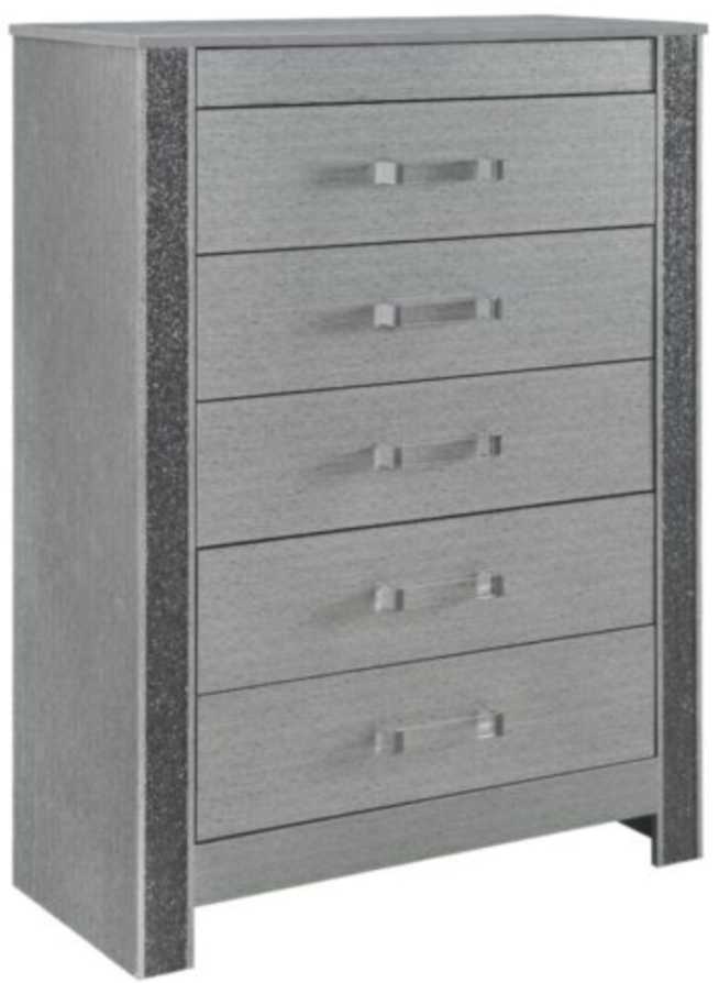 The Logan chest combines sleek aesthetics with functional storage. Featuring a silver finish and sparkling crushed crystal accents, this chest provides spacious drawers to keep your belongings organized. Its glamorous design adds a touch of luxury to any bedroom decor.Read More