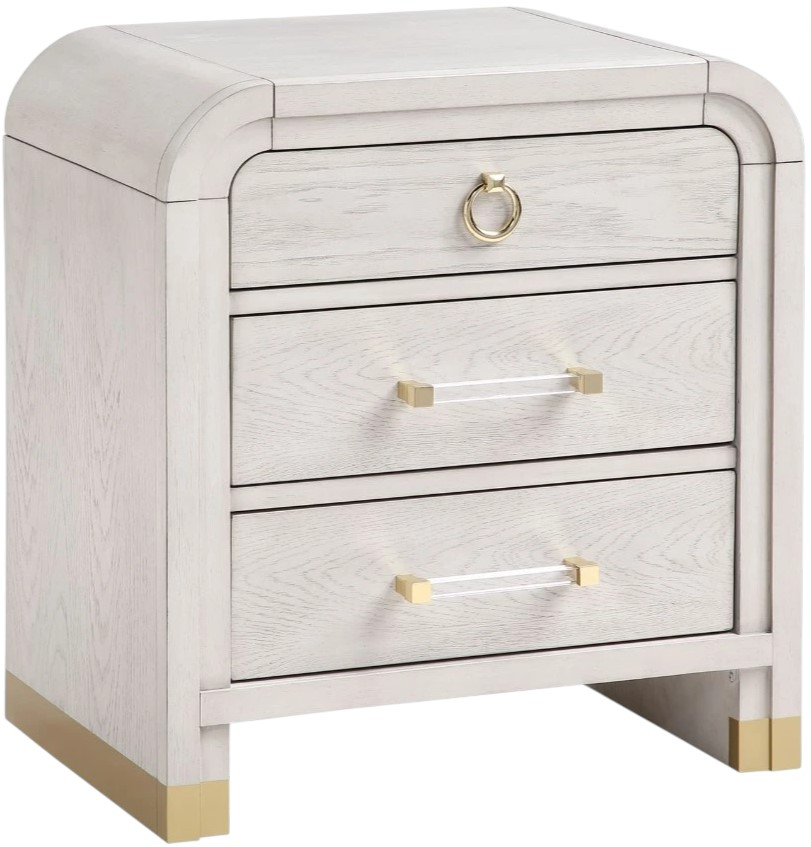 The Malmo Nightstand combines style and convenience with three roomy drawers, each accented by acrylic handles with gold detailing. Rounded edges and a light beige oak veneer finish enhance its modern appeal, while gold-accented legs elevate the design with a touch of glamour.Read More