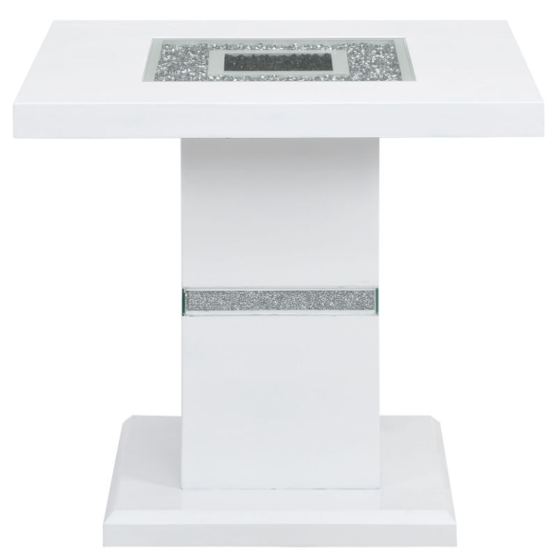 Constructed of MDF, Glass and Acrylic this dining table makes a bold statement. Finished in a White and Silver with a center glass, square shape and pedestal base you will have more than enough room to entertain.