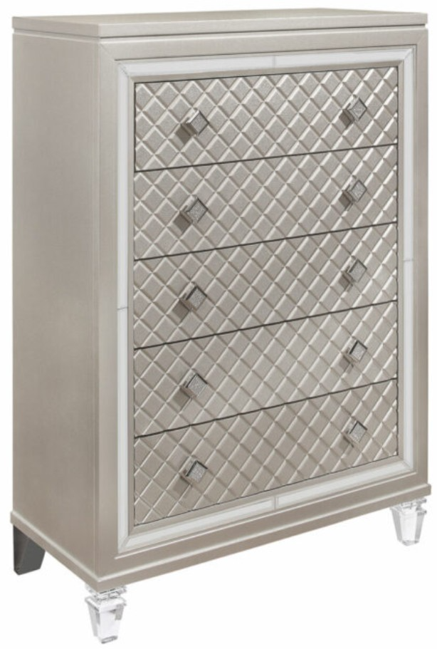 Reach your design goals in your bedroom with this Paris Champagne Chest. Featuring eye-catching platinum metallic finish, to the fancy acrylic legs and ambient LED lighting. Make a bold statement by incorporating this stunning into your home.Read More
