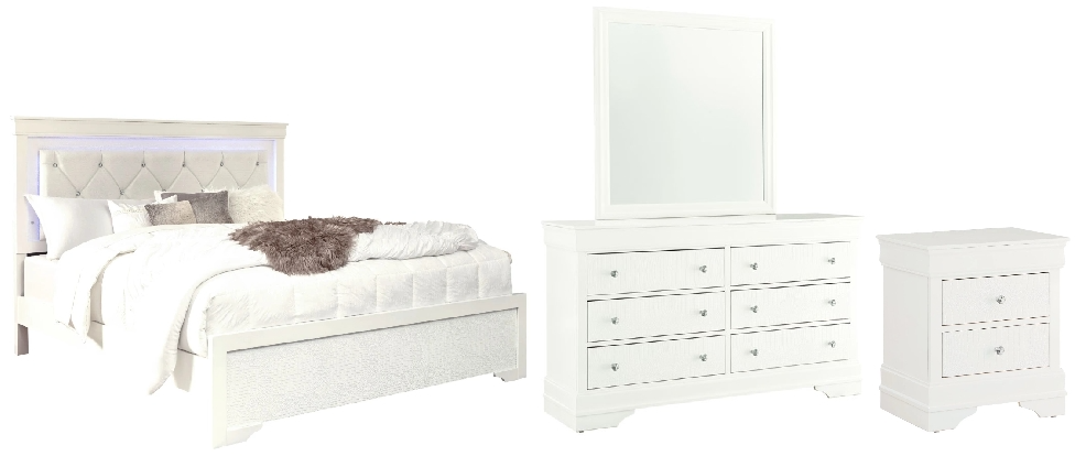 Includes: (1) queen bed, (1) dresser, (1) mirror and (1) nightstand