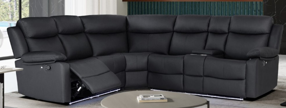 The U6026 Sectional delivers spacious comfort with a modern edge. It features a right-facing console reclining loveseat, a left-facing reclining loveseat, and a wedge for ample seating. Upholstered in sleek black PU, it includes manual reclining seats, LED lighting, and a convenient console with storage and cupholders perfect for entertaining or everyday lounging.Read More