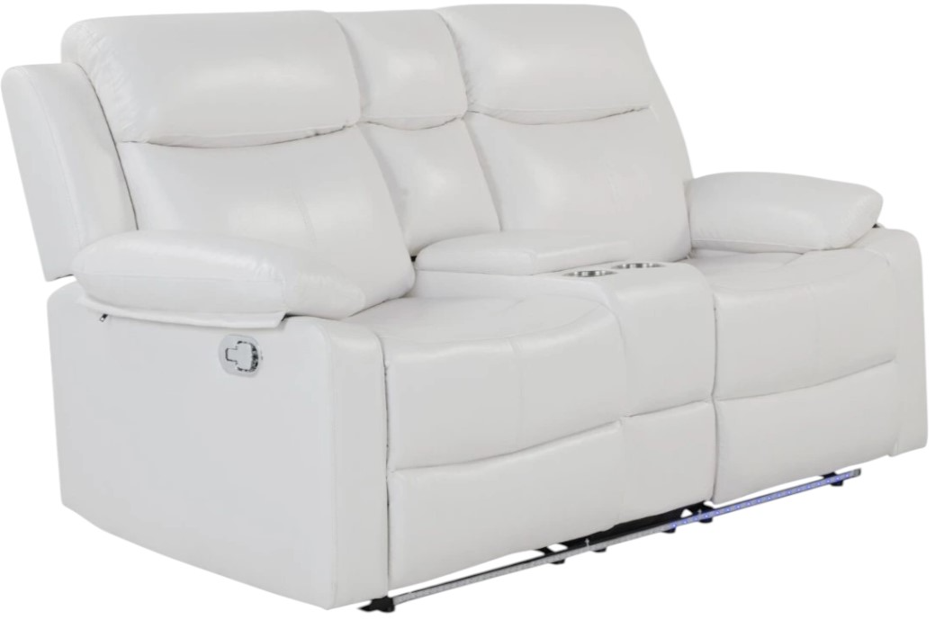 The U6026 Console Reclining Loveseat offers both luxury and convenience. Finished in blanche white with manual reclining seats, it includes a center console with storage and cupholders, ensuring your essentials are always close at hand. Built-in LED lighting adds a stylish glow, making this loveseat a polished addition to your home.Read More