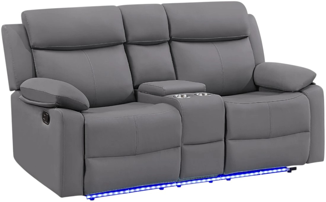 Enjoy both comfort and functionality with the U6026 Console Reclining Loveseat with LED Lighting. This loveseat, upholstered in grey PU, features generously padded cushions and a smooth reclining mechanism for ultimate relaxation. The built-in cupholders and convenient storage compartment add a practical touch, making it perfect for entertaining or cozy nights in.Read More