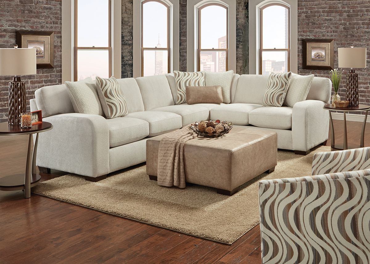 Contemporary Sectional In An Oyster Color Textured Fabric. Group Features Waterfall Arm Styling. Reversible Seat Cushions With Removable Back Pillows. Very Deep Seating. Available Accent Chair And Ottoman.Read More