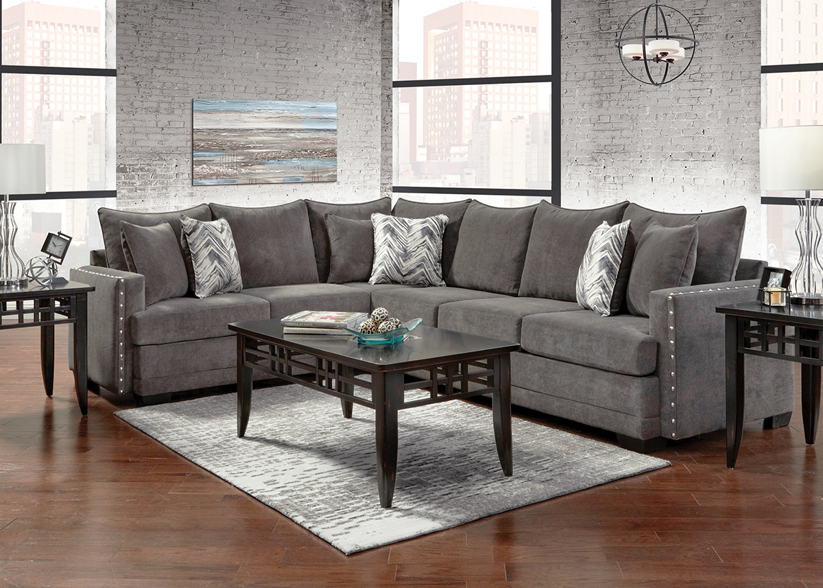 Contemporary Style In A Dark Grey Textured Fabric. Large Silver Finish Nailheads Detail Front And Top Of Arms. Group Features Reversible Seat Cushions With Oversized Removable Back Pillows.Read More