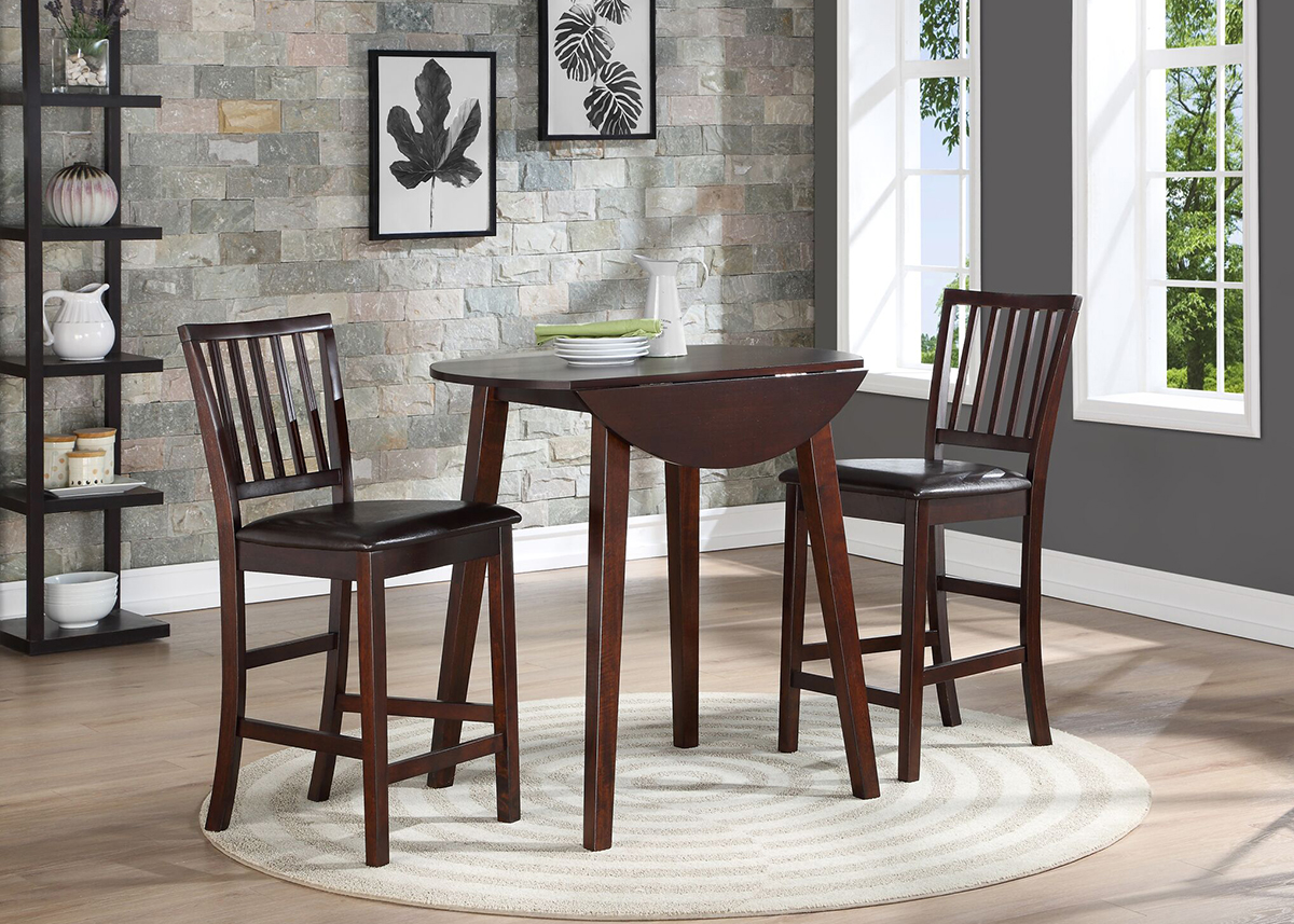 Three Piece Pub Set With Two Drop Leafs. Expresso Finish. Slat Back Pub Chairs With Dark Brown Pu Seating.Read More