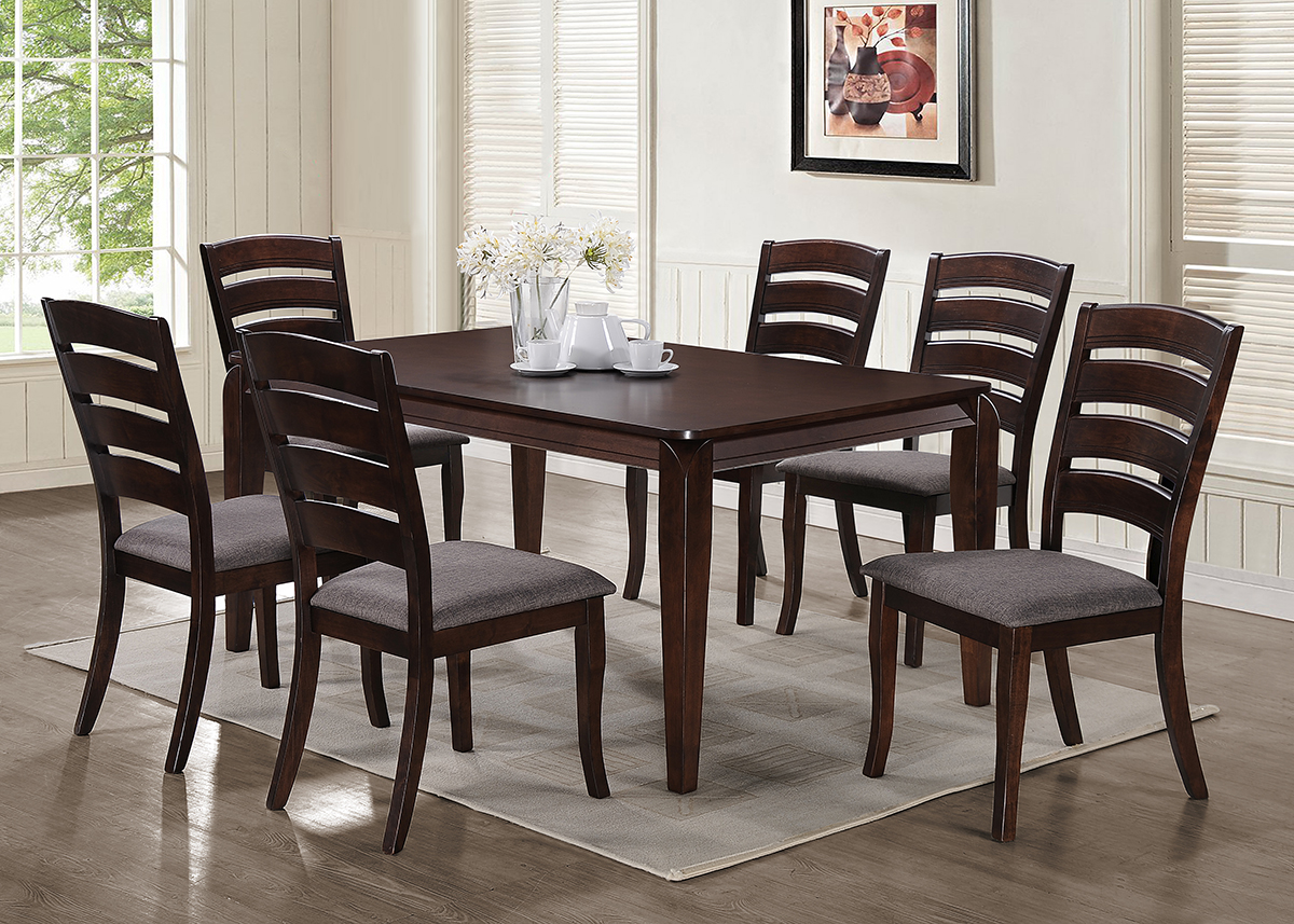 Casual Dining In A Brown Finish With Natural Distressing. Beveled Cut Table Legs With Angled Table Apron For A Subtle Look. Heavy Slatted Back Chairs With Thick Brown Seat Cushions. Accomodates Up To Six Chairs.
