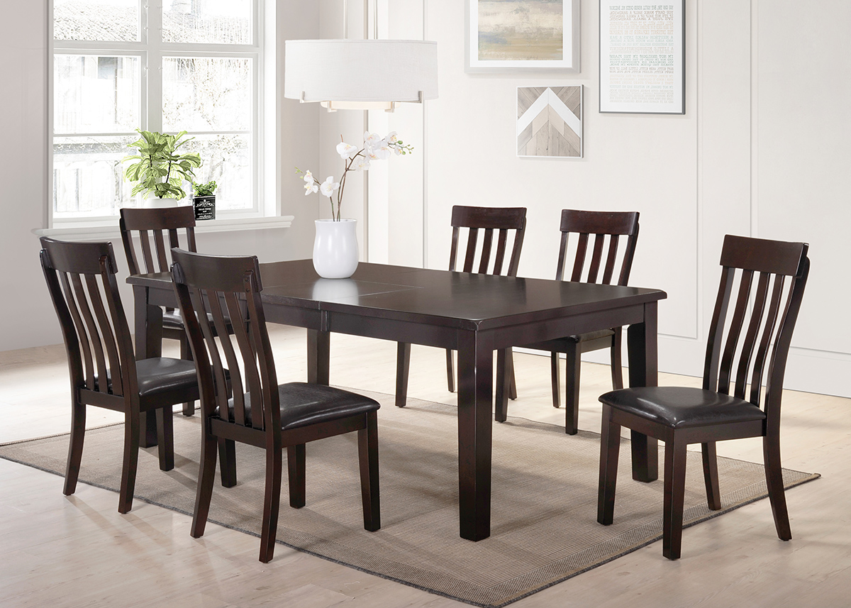 Transitional Style Dining Set In A Espresso Finish. Table Features A Plank-Style Top With Self Storing Butterfly Leaf. Slat Black Chairs Have Contoured Shaping. Dark Brown Pu Seat Cushions.