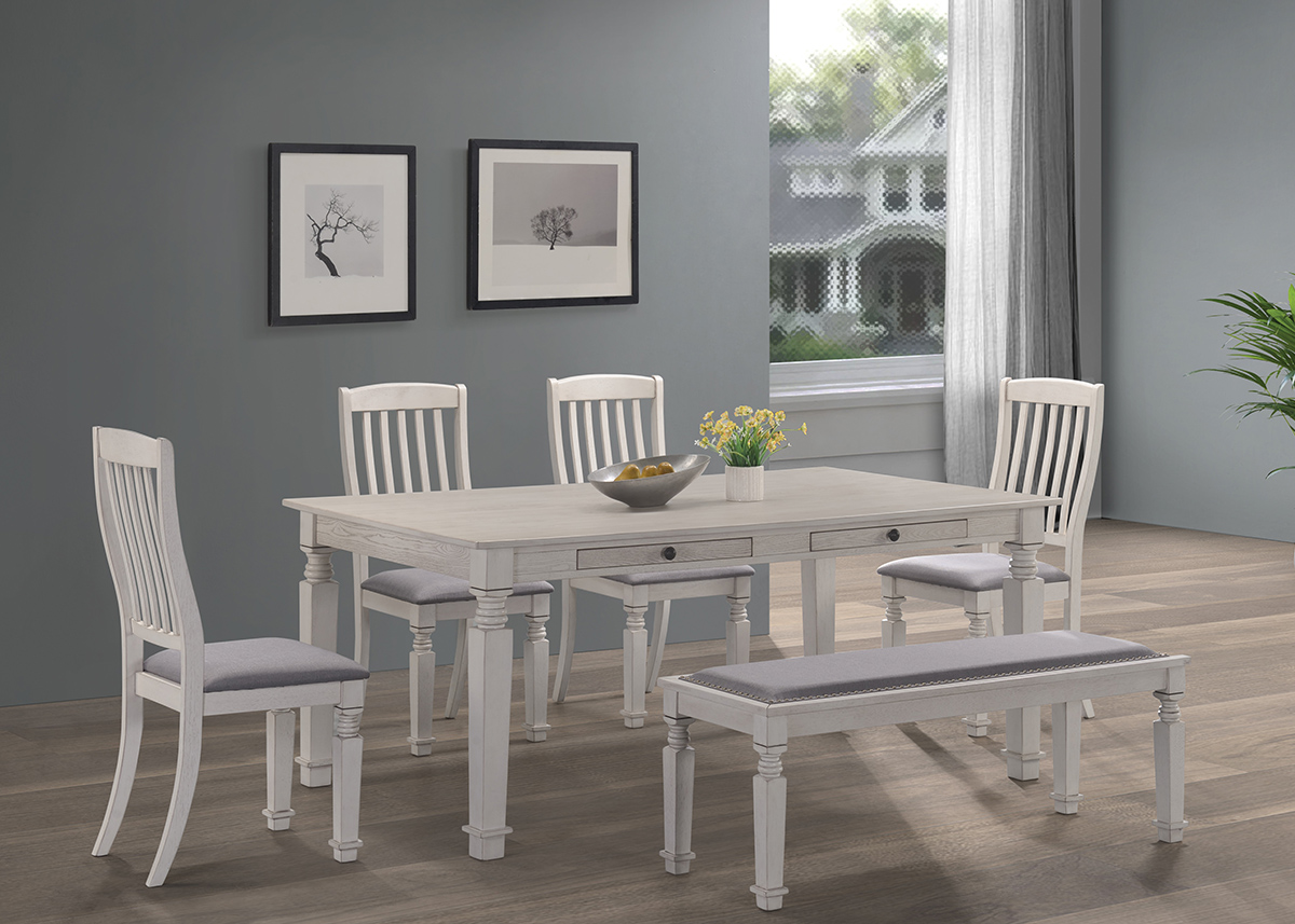 Rustic Design Dining Set In A Antique White Finish. Table Features Farm House Shaped Legs And Working Drawers. Chairs Have Shaped Backs With Matching Farm House Look Front Legs. Grey Textured Seat Cushions. Matching Bench Is Available.Read More
