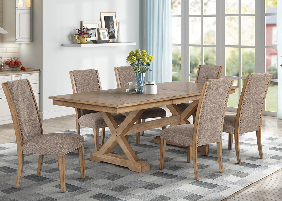 Contemporary Dining Set With A Rustic Blend In Medium Brown Finish. Set Features A Fancy Wood Veneer Table Top, Rustic Look Trestle Base And Removable Table Leaf. Contoured Chair Backs With Bronze Finish Nail Heads.. Seats And Back Upholstered In A Complimentary Sand Colored Texture Fabric.
