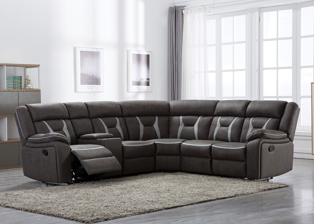 Six -Piece Modular Motion Sectional In A Grey Pu Fabric With A Heavy Contrasting Welt On Seats, Backs And Arms. Group Features Storage Console With Two Reclining Ends. Sectional Can Be Expanded With Additional Armless Chairs. Extra Consoles And Armless Chairs Are Available And Can Be Added For More Seats.