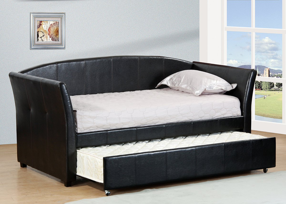 Modern Style Day Bed In An Espresso Color Pu. Day Bed Has An Underneath Twin Trundle. Trundle Is On Castors. Day Bed Is Mattress Ready. Converts Into Two Twin Beds.Read More
