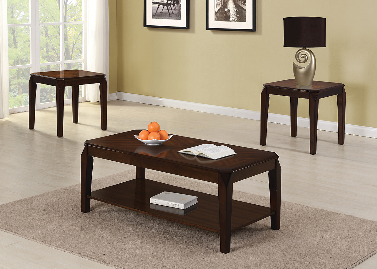 Transitional Styled Tables In An Espresso Finish. Tables Feature Fancy Wood Veneer Tops And Cocktail Table Has Bottom Shelf. Shaped Table Leg With Beveled Legs.