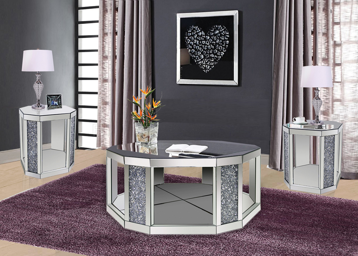 Very Glitz And Bold Styling. Octagon Shaped Cocktail Table With Mirror Top And Bottom Shelf. End Table Follow Same Octagon Shape. Glitter Faux Crystal Accents.